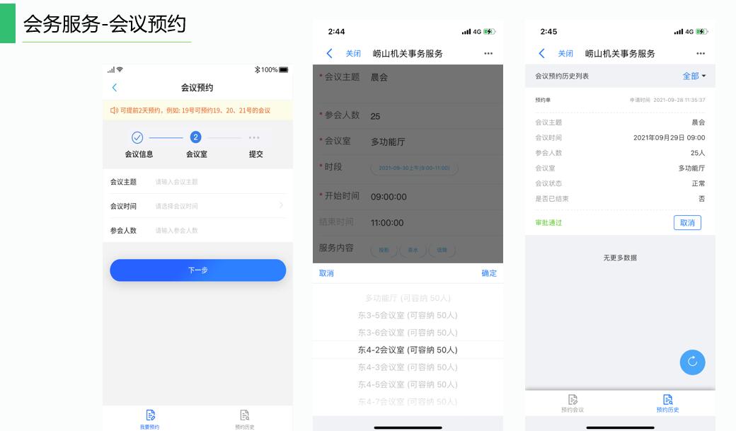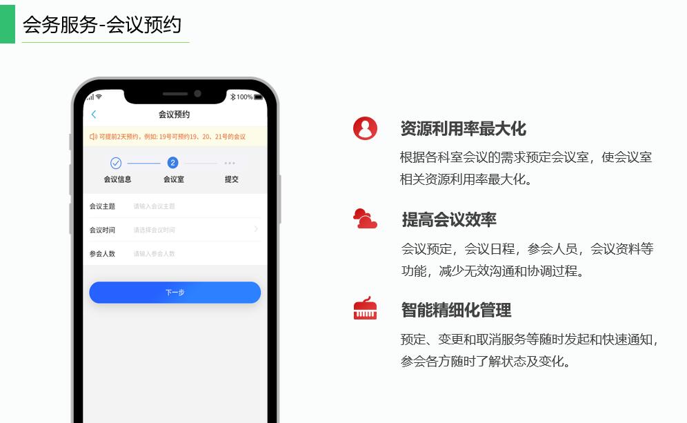 智慧會(huì )務(wù)系統可實(shí)現功能包括:會(huì )議預約、會(huì )議管理、會(huì )議發(fā)布、會(huì )議考勤、會(huì )議統計等。通過(guò)該系統可有效將機關(guān)內各會(huì )議室進(jìn)行合理管理,確保使用人員可正常使用會(huì )議室。
